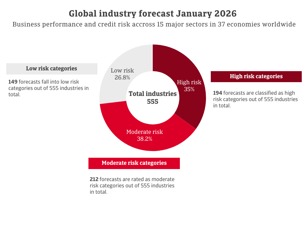 En total, se han emitido 555 pronósticos: 149 caen en categorías de bajo riesgo, 212 están clasificados como riesgo moderado, y un segmento significativo de 194 está clasificado como alto riesgo. Las previsiones para alimentos, productos farmacéuticos, servicios financieros, productos químicos, electrónica/TIC y agricultura son más favorables que el índice general. Las máquinas/ingeniería y los servicios permanecen en niveles de riesgo medio. El transporte, la automoción, los bienes de consumo duraderos y el papel muestran un riesgo elevado. El panorama más negativo se concentra en la construcción, metales/acero y textiles.