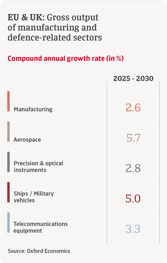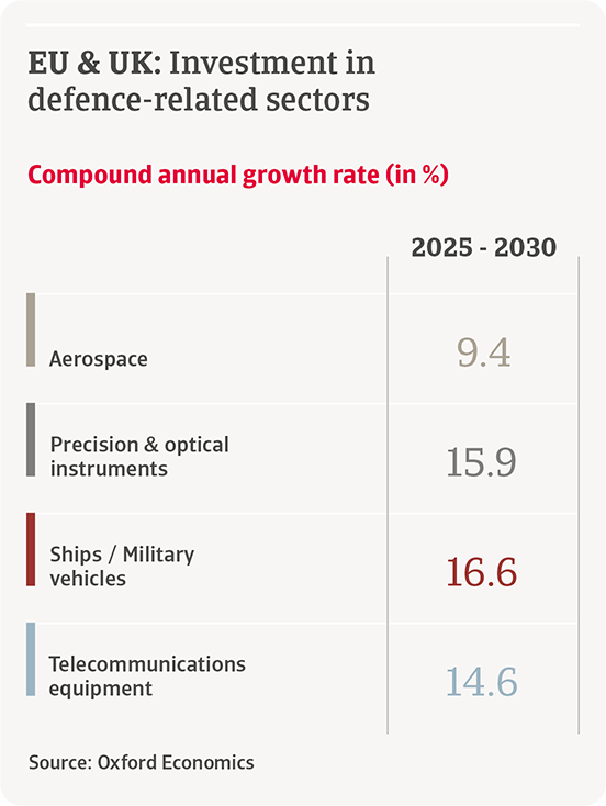 A pesar de las dudas sobre la magnitud de cualquier repunte en la manufactura, claramente habrá ganadores en la carrera de rearme de Europa. Un subconjunto concentrado de sectores intensivos en capital verá el mayor crecimiento de producción en los próximos cinco años. Incluyen barcos y vehículos militares, aeroespacial, instrumentos de precisión y ópticos, y equipos de telecomunicaciones. En comparación con la manufactura, esos sectores verán un crecimiento del producto bruto superior al promedio en los próximos cinco años en la UE y el Reino Unido.
