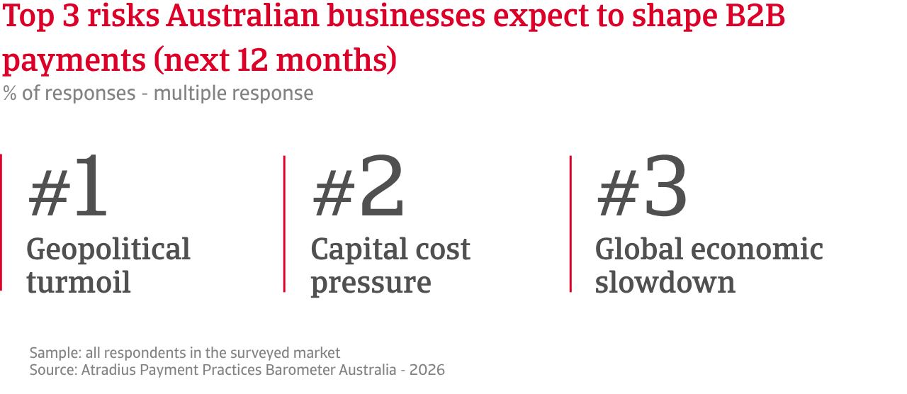 Las empresas encuestadas en Australia informan una creciente preocupación por los volátiles mercados globales, ya que la actual agitación geopolítica está interrumpiendo significativamente los flujos comerciales. La incertidumbre sobre cómo evolucionará la situación está añadiendo aún más presión a las cadenas de suministro. Se espera que los costos operativos sigan siendo altos, mientras que es probable que la fiabilidad del transporte se deteriore aún más en los próximos meses. Las empresas anticipan que las interrupciones a lo largo de las principales rutas comerciales seguirán alargando los tiempos de entrega y tensando las cadenas de suministro. Es probable que estos acontecimientos influyan directamente en los gastos operativos y en la forma en que las empresas priorizan los pagos. Muchas empresas anticipan un cambio claro en el comportamiento de pago B2B durante los próximos meses a medida que los clientes evalúan su propia liquidez y ajustan los calendarios de pago en consecuencia.