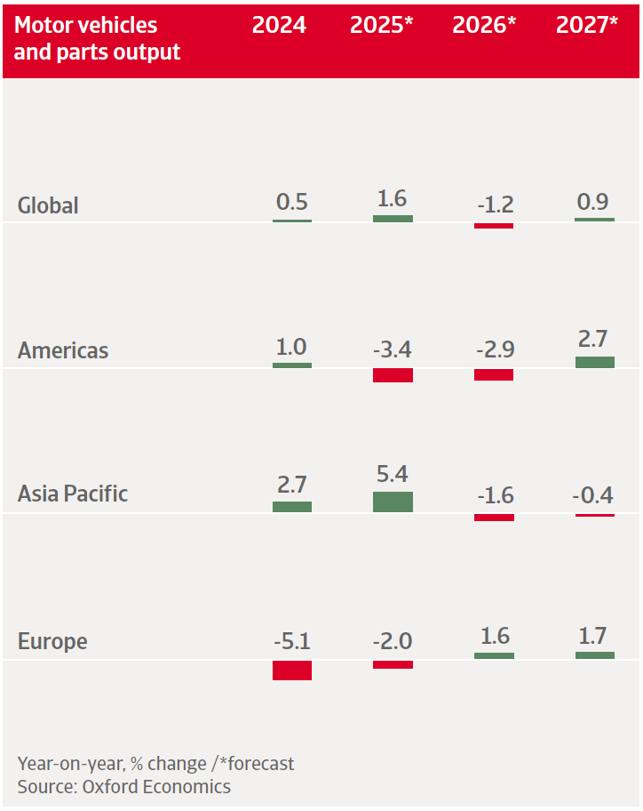 - Global: Esperamos que la producción global de vehículos de motor y piezas crezca un 1.6% en 2025, seguida de una contracción del 1.2% en 2026. Esta disminución se debe en parte a los aranceles de EE. UU.
