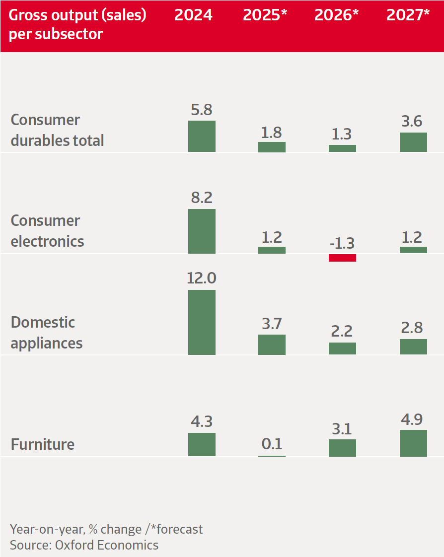 - Después de aumentar un 5.8% en 2024, se prevé que el crecimiento de las ventas globales de bienes duraderos de consumo se desacelere al 1.8% en 2025 y al 1.3% en 2026.
